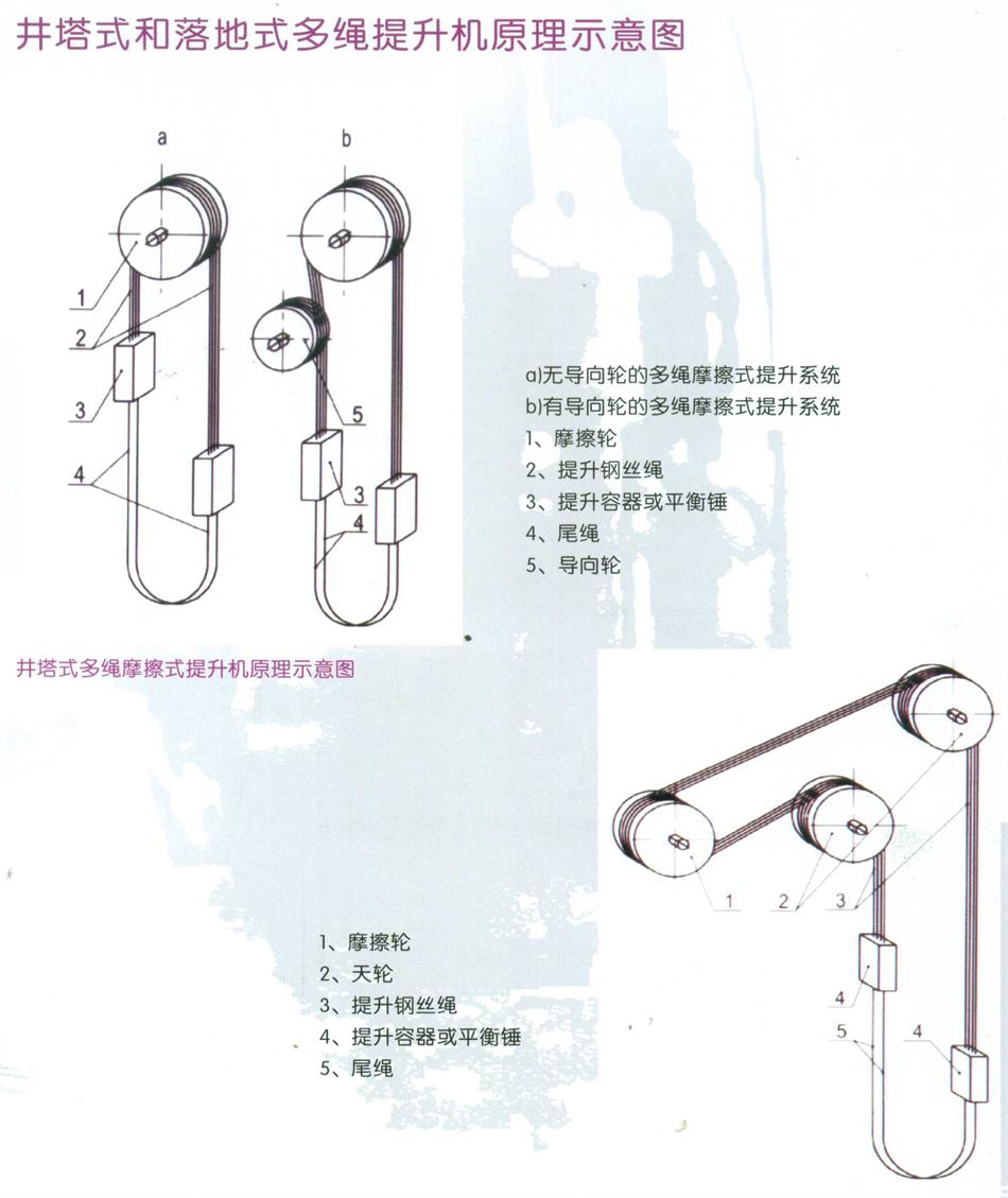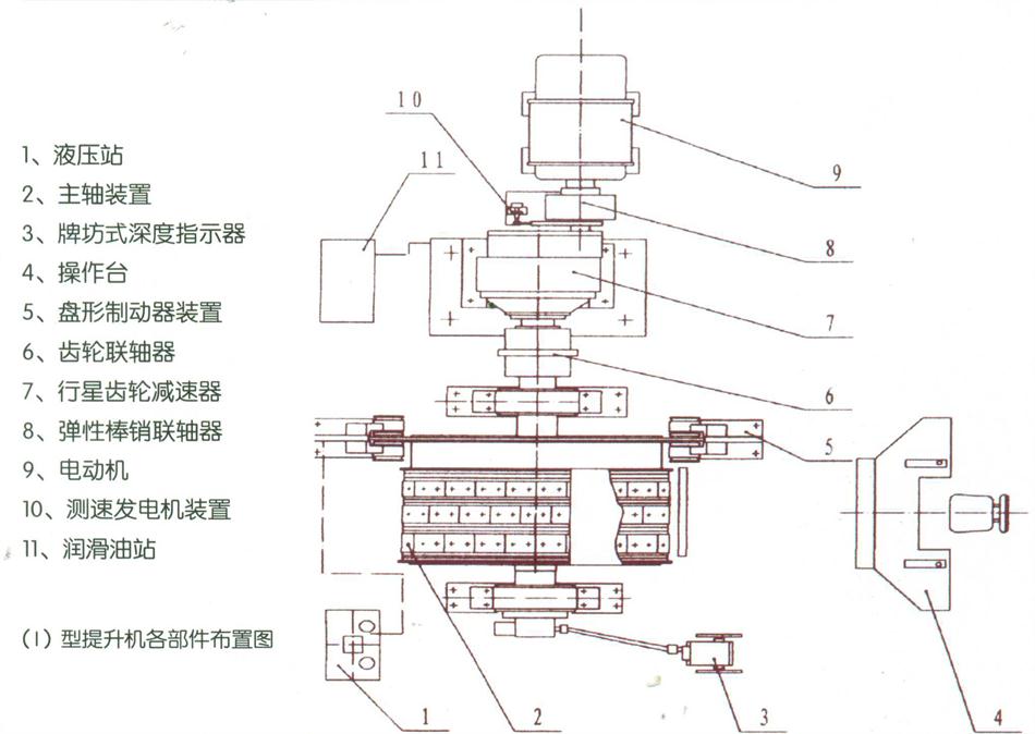 中間掛有容器的封閉鋼絲繩纏繞在卷筒上,當(dāng)電機(jī)帶動卷筒轉(zhuǎn)動時,通過鋼絲繩與卷筒的摩擦力實(shí)現(xiàn)容器的提升與下放;通過電氣傳動實(shí)現(xiàn)調(diào)速;盤形制動器通過液壓與電氣控制實(shí)現(xiàn)制動;通過各種位置指示系統(tǒng)實(shí)現(xiàn)容器的深度指示;通過各種傳感器與控制元件組成的機(jī)、電、液聯(lián)合系統(tǒng),進(jìn)行整機(jī)的監(jiān)控與保護(hù);通過計算機(jī)和網(wǎng)絡(luò)技術(shù)實(shí)現(xiàn)提升機(jī)內(nèi)、外的信息傳輸。